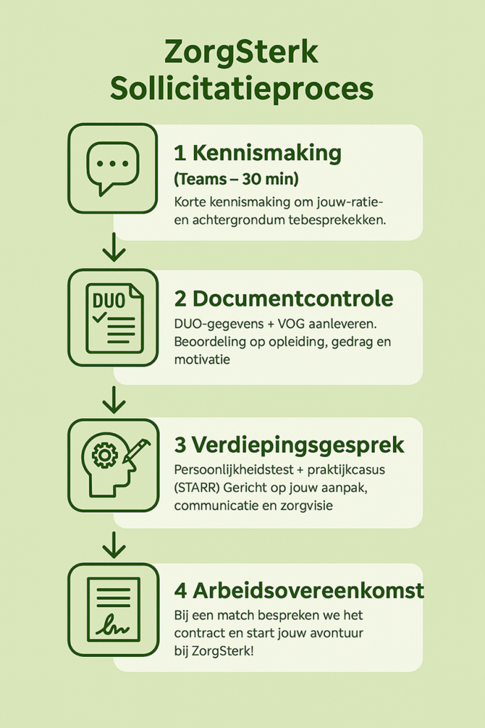 Bij ZorgSterk geloven we in kwaliteit en persoonlijkheid. Daarom bestaat ons sollicitatieproces uit meerdere stappen, zodat we zeker weten dat jij past binnen ons team én bij onze opdrachtgevers.